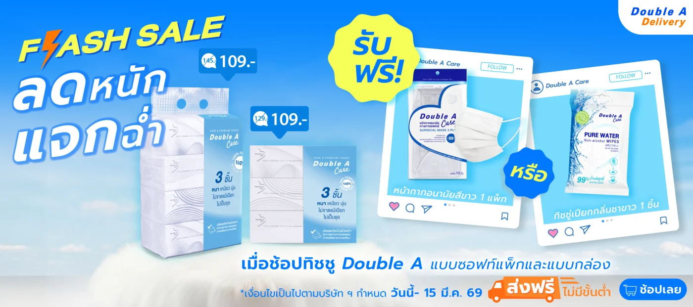 Double A Care เพียว &พรีเมียมทิชชู หนา 3 ชั้น แบบซอฟท์แพ็ก รับฟรี หน้ากากอนามัยสีขาว แบบแพ็ก 1 แพ็ก