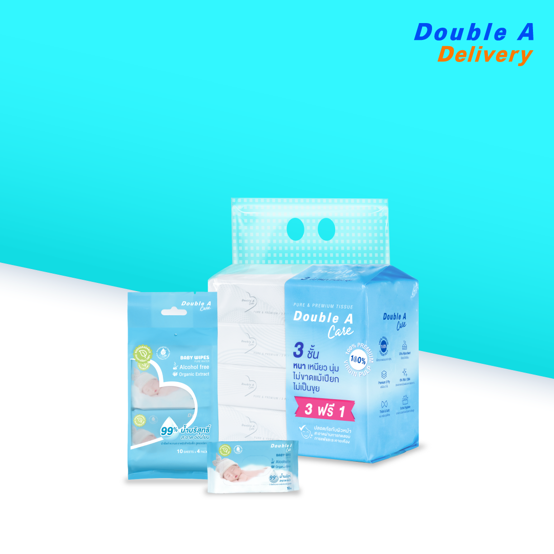 ![เซต [ทิชชูทราเวลแพ็กลายโลโก้ 1 แพ็ก + เบบี้ ไวพส์ เพียว วอเตอร์ บรรจุ 10 แผ่น/แพ็ก (แพ็ก 4) 1 ชิ้น] Double A Care - Image 3](https://delivery.doubleapaper.com/wp-content/uploads/2023/05/LINE_ALBUM_สื่อการขาย-Pure-_-Premium-Tissue-New-25.11.67_250312_4.jpg)